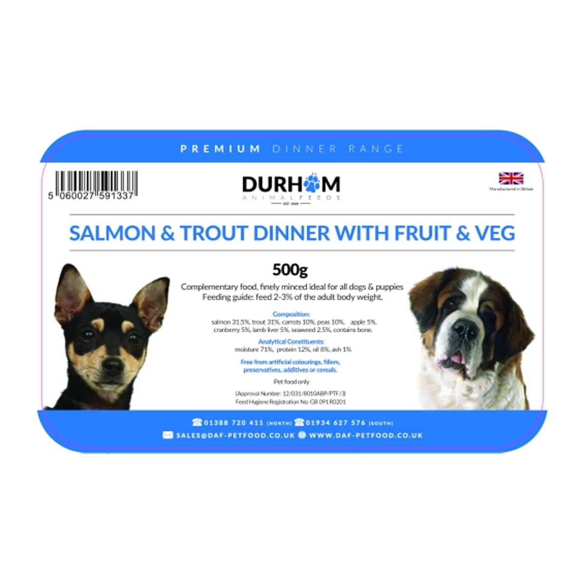 Durham Salmon & Trout Dinner with Veg 500g offers a nutritious raw diet rich in high-quality proteins and omega-3 fatty acids from salmon and trout. Enhanced with carefully selected vegetables, this meal supports digestive health and provides essential vitamins and minerals. Designed to promote strong muscles, healthy skin, and an active lifestyle, it is an excellent choice for dogs requiring a balanced and natural diet.
